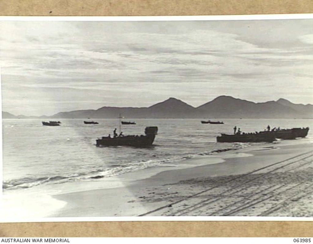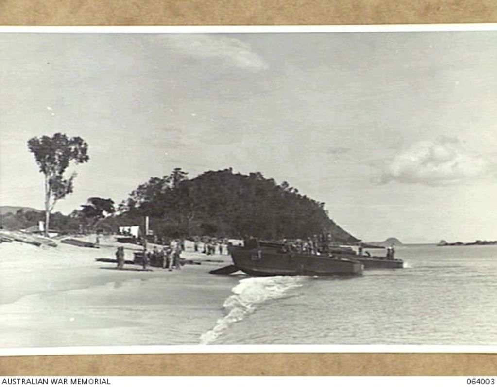 TRINITY BEACH, QLD. 1944-02-01. BARGES, LOADED WITH TROOPS OF THE 1ST ORDNANCE BEACH DETACHMENT, PULLING OUT FROM THE BEACH DURING AMPHIBIOUS EXERCISES.