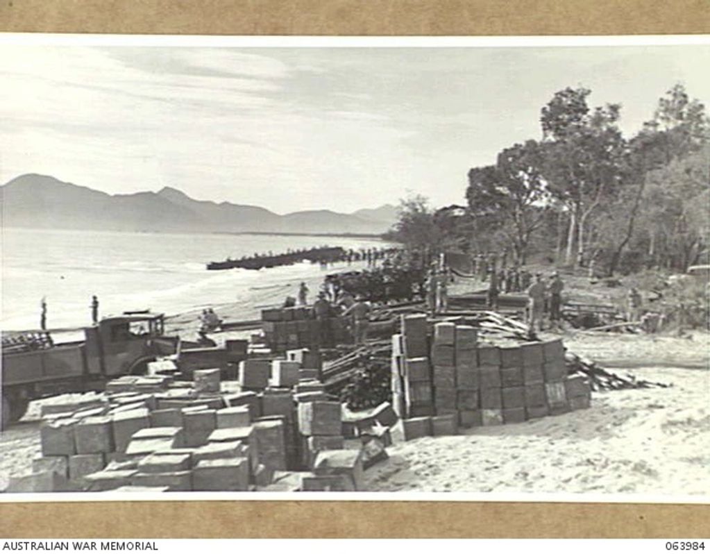 TRINITY BEACH, QLD. 1944-02-01. GENERAL VIEW OF THE BEACH SHOWING STORES IN THE FOREGROUND AND TROOPS MOVING ON TO BARGES DURING THE AMPHIBIOUS EXERCISES OF THE 1ST ORDNANCE BEACH DETACHMENT.